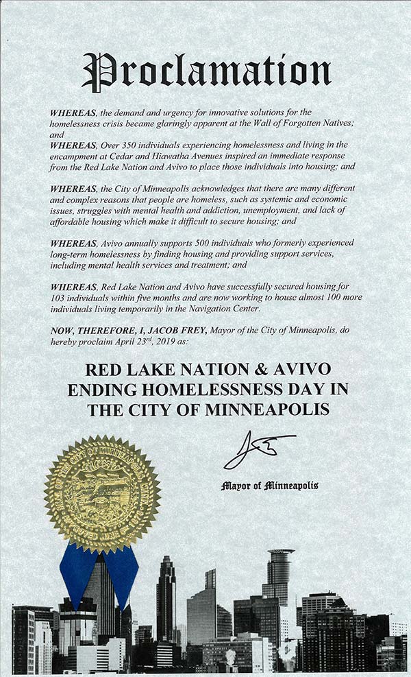 Minneapolis Mayor Jacob Frey has declared Tuesday, April 23, to be “Red Lake Nation & Avivo Ending Homelessness Day in the City of Minneapolis.”