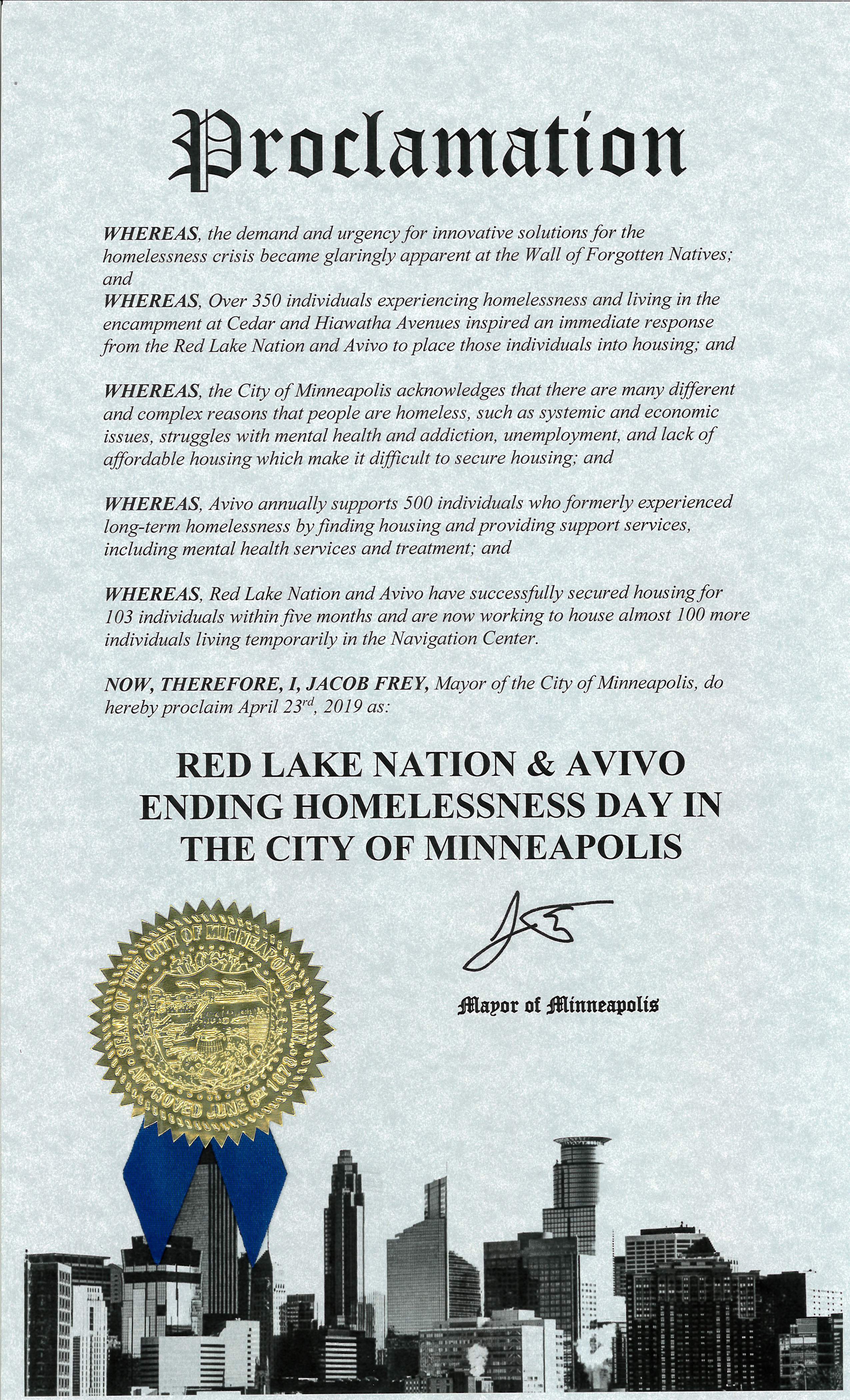 Minneapolis Mayor Jacob Frey has declared Tuesday, April 23, to be “Red Lake Nation & Avivo Ending Homelessness Day in the City of Minneapolis.” This is the official document associated with the proclamation – click image for full resolution version.