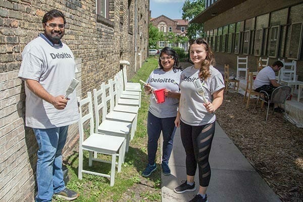 Deloitte volunteers paint chairs for Avivo’s Family Residential Treatment program (pictured) in early June, 2019. In featured image (top), Deloitte volunteers pose after expanding a patio space for use by mothers in Avivo’s treatment programs.