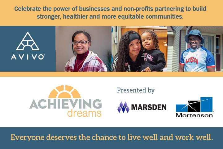 Achieving Dreams Breakfast header graphic, with photos of three Avivo success stories and the Achieving Dreams logo and the words Presented By Marsden and Mortenson